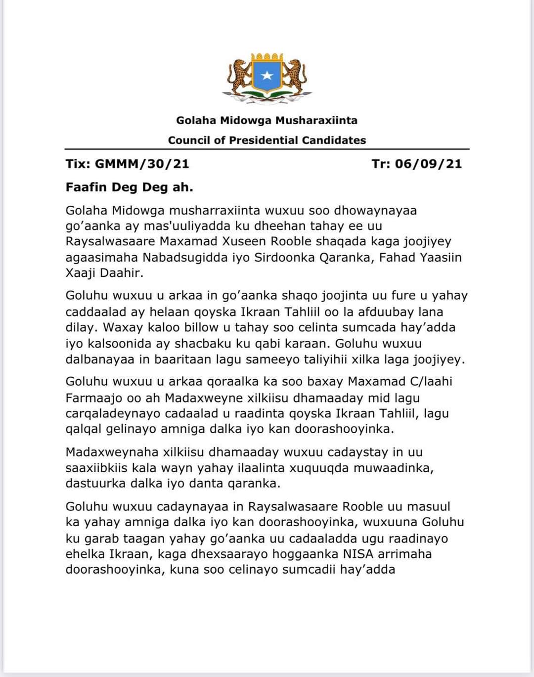Sidoo kale Midowga Musharixiinta ayaa waxaa ay sheegeen in baaritaan lagu sameeyay Taliyaha Nisa, sidoo kale qoraalka kasoo baxay MD Farmaajo ay u arkaan mid lagu carqaladeeynayo cadaalad u raadinta qoyska Ikraan Tahliil, lagu khalqal gelinayo amniga dalka iyo doorashooyinka waa sida ay hadalka u dhigeen.