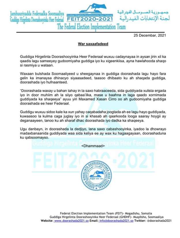 “Guddiga Hirgelinta Doorashooyinka Heer Federaal wuxuu cadaynayaa in aysan jirin xil ka qaadis lagu sameeyey guddoomiyaha guddiga iyo ku xigeenkiisa, ayna howlahooda shaqo si rasmiya u wataan.” ayaa lagu sheegay warka lagu daabacay bogga Facebook-gga ee guddiga.