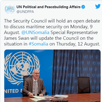 Wakiilka gaarka ah ee xoghayaha guud ee Qaramada Midoobey ee arrimaha Soomaaliya James Swan ayaa Golaha Amniga warbixin ka siin doonaa arrimaha amniga ee xeebaha Soomaaliya, sida lagu soo qoray barta Twitter-ka ee xafiiska Qaramada Midoobey ee qaabilsan nabadda iyo siyaasadda.