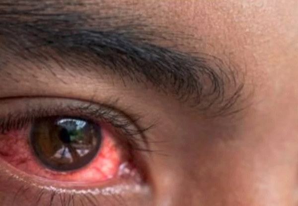 Caabuqan oo indhaha casaan ka dhiga ayaa astaamaha lagu garto waxaa ka mid ah, xasaasiyad ama indho cuncun, barar iyo dheecaan isha ka imaada.