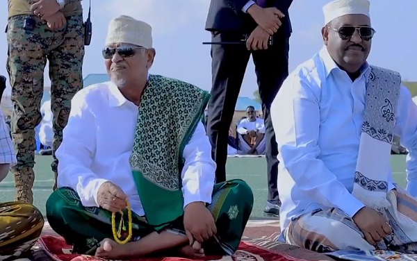 Madaxweynaha maamul goboleedka Soomaaliyeed ee Puntland Siciid Deni, Kuxigeenkiisa Axmed Karaash & Guddoomiyaha baarlamaanka Puntland ayaa garoonka kubadda cagta ee Garowe kula tukaday boqolaal dadweyne ah salaadii ciida.