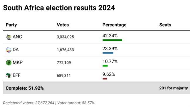 Ilaa iyo hadda xisbiga haya talada dalkaasi ee ANC ayaa helay in ka badan boqolkiiba 42 ee codadkii la dhiibtay ee la tiriyay.