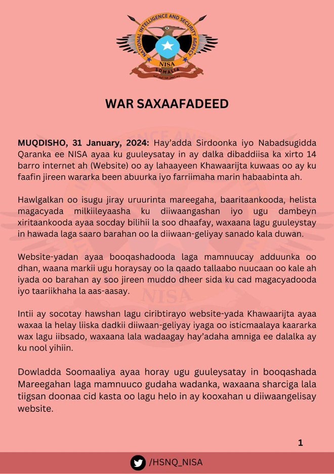 War qoraal ah oo ka soo baxay hay’adda NISA ayaa lagu sheegay in si rasmi ah hawada looga saaray 14 Website oo laga heli jiray macluumaadka kooxda, islamarkaana laga dhageysan jiray qaarkood Idaacadda ku hadasha afka kooxdaasi.