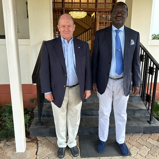 Hoggaamiyaha isbeheysiga mucaaradka ee Azimio La Umoja-One Kenya Raila Odinga ayaa ismaamulka Kisumu ee gobolka Nyanza kulaN albaadbada u xiran yahay kula yeeshay senatarka gobolka Delaware ee dalka Maraykanka Chris Coons.