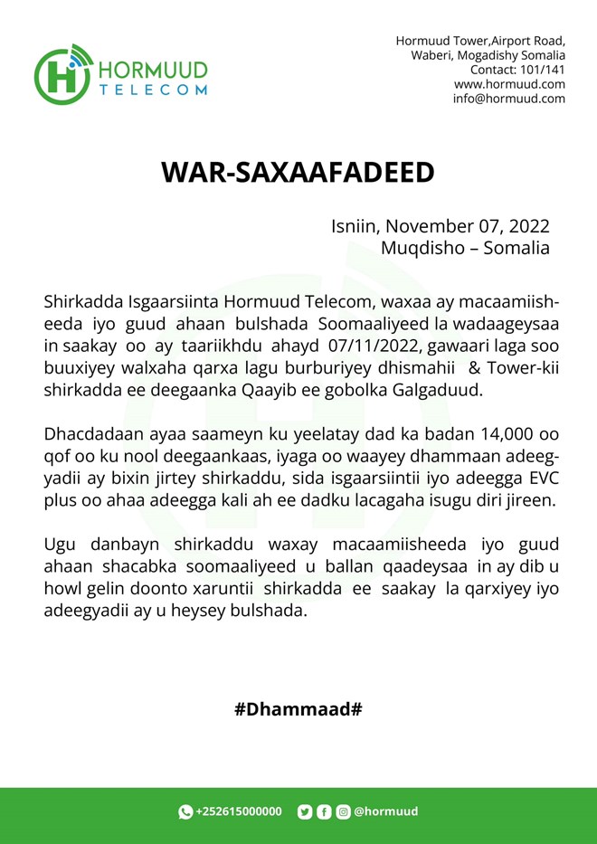 click👉https://t.co/paJZJCMIec pic.twitter.com/JSmADVtNmO— Hormuud Telecom (@Hormuud) November 7, 2022