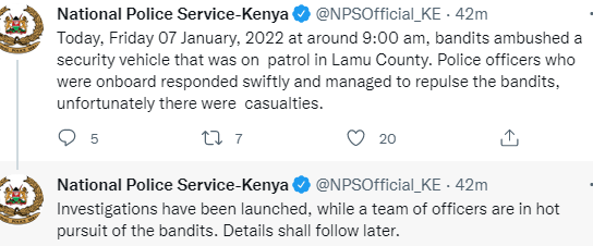 Waaxda qaran ee adeegga booliska dalka ee (NPS) ayaa bayaan ay soo saartay ku xaqiijisay in abaaro 9-kii subaxnimo ee maanta kooxo burcad ah weerar gaadmo ah ku qaadeen gaari ay la socdeen ciidamada ammaanka oo roondo ka waday ismaamulka Lamu.