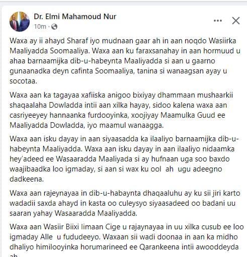 Qoraal uu soo dhigay bartiisa rasmiga ee Facebook-ga, ayuu Cilmi Maxamuud nuur sheegay in intii uu xilka haayay uu hormuud u ahaa barnaamijka dib u habeynta maaliyadda, islamarkaana uu ku faraxsan yahay xil ka qaadista lagu sameeyay.